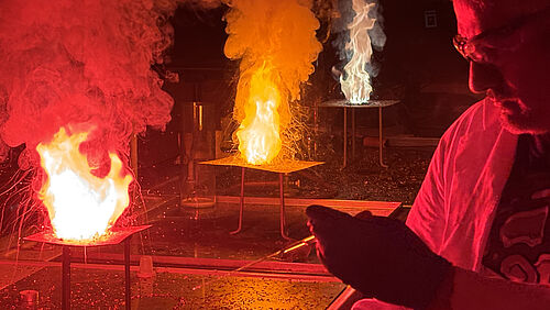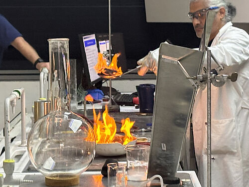 Mit faszinierenden Experimenten, die von Prof. Dr. Axel Schulz und Edgar Israel Ramirez Tinoco präsentiert wurden, wurde das Phänomen Feuer auf anschauliche und unterhaltsame Weise erklärt. Von der chemischen Reaktion über die Energieumwandlung bis hin zu den Sicherheitsaspekten – die Teilnehmer:innen erhielten nicht nur wissenschaftliches Wissen, sondern auch einen Einblick in die Arbeitsweise der Chemie in der Forschung.