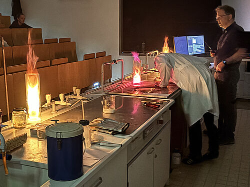 „Die Begeisterung der Schüler:innen war spürbar – von den ersten Experimenten bis zum abschließenden Fragen-Austausch“, berichtet Prof. Schulz, Inhaber des Lehrstuhls für Anorganische Chemie. „Es ist besonders erfreulich, dass so viele junge Menschen sich für die Chemie begeistern und die Möglichkeit nutzen, chemische Experimente hautnah zu erleben.“